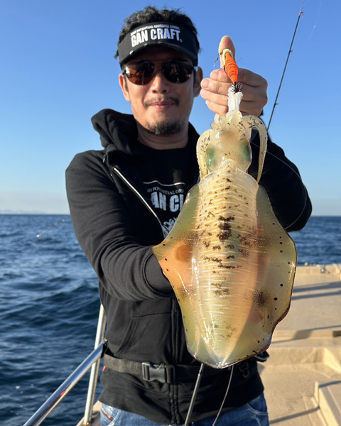 人生2度目のティップランエギングに風、波があり、アタりが取りにくい中、ライン感度に助けられて僅かな当たりをとらえることができ、釣果につながりました。