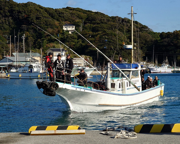 大会当日は、北東風の強風で風波がありましたがすさき丸と弁天丸の2船は外浦から下田湾の安全な磯に選手を降ろしていきました。