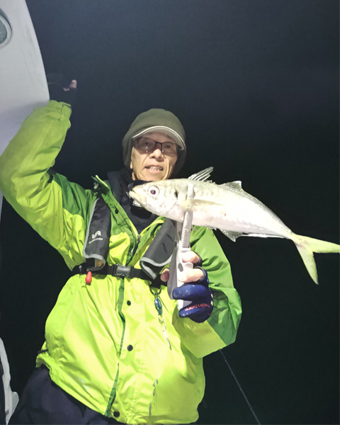 当日は天候にも恵まれ、多少うねりがあるものの釣りをするには問題が無い状況で18時前に出港し実績ポイントに。幸先よく30cm超の丸々と太ったアジをキャッチするもアタリが遠い状況。何か所かポイントを移動後、魚探への反応がこれまでとは違う反応となりバイトも出始めました。