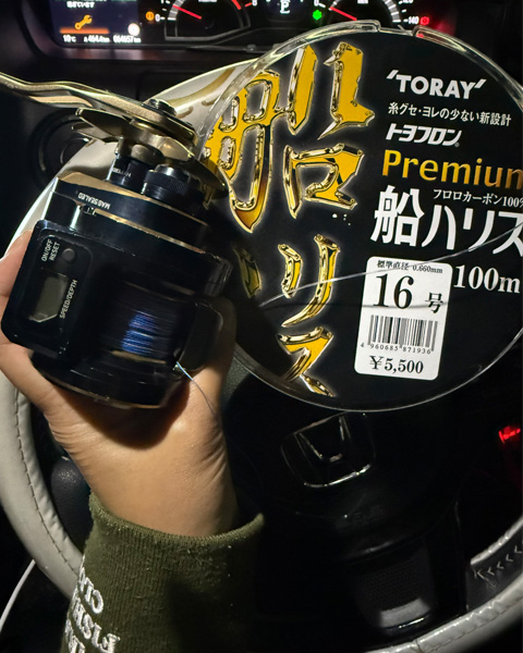 今回ラインのセッティングは「スーパーストロングPE 船 F4 3号」、リーダーは「トヨフロン®プレミアム船ハリス 16号」。今回は10kgオーバーの鰤や平政、巨大な鰆も視野に入れて太めで設定。車の中でノットを組んでいざ!