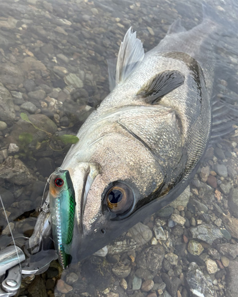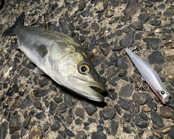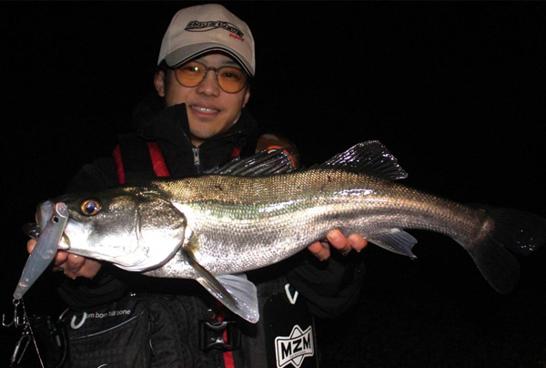 タックルは「シーバスPEパワーゲーム 1号」に、「ショックリーダースムーズロック®プラス 5号」をミッドノットで結束。10フィートのシーバスロッドにミノーやシンキングペンシルを主体に釣りを展開。