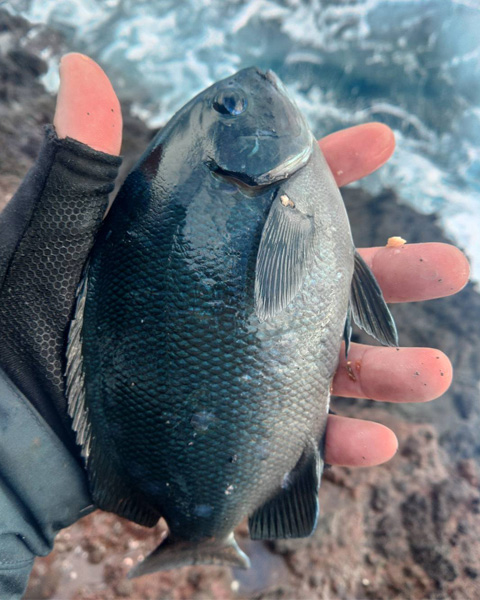 ウネリと満潮が重なり本命ポイントには立てず少し離れた安全な高い場所から釣りを開始。すると大サラシで仕掛けは馴染まない、釣れるのは良型ではなく手のひらサイズのコッパグレ、イスズミと苦戦しました。