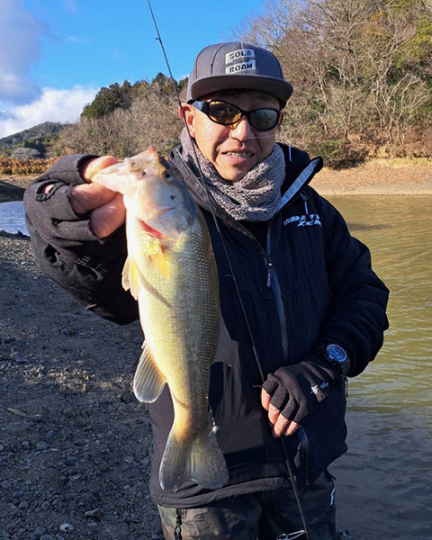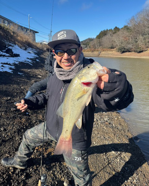 急激な水温の低下で、池の底にお腹をつけ動かないバスを狙いネコリグで釣り開始。30分ほどで小さいですがヒット!