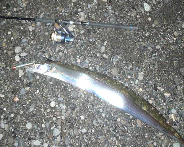 数キャスト。あれ? 流れがおかしい。動いているけど生命感がない。逆にちょっと前まで釣っていた場所ががら空き。あっちのほうが上じゃね? すぐに戻ってミノーをキャスト。水面の根がかり!! いい太刀魚がヒットした。