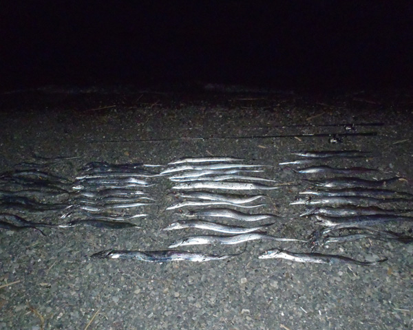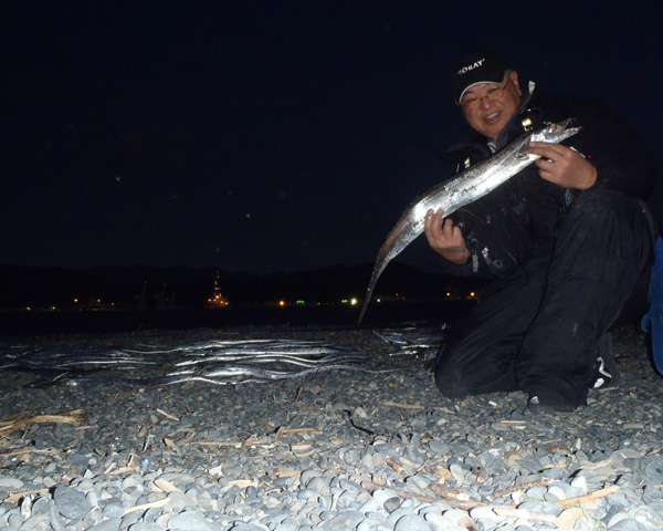 途中まではクーラーバックに入れていたがふらふらになり浜に投げられた太刀魚を集めて並べていると帰り際の釣り人が避けていく。写真を撮ってもらいたかったが遠巻きでだれも目を合わせてくれない。