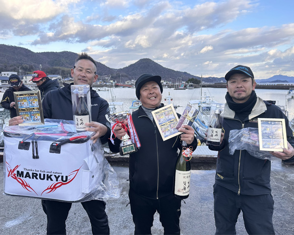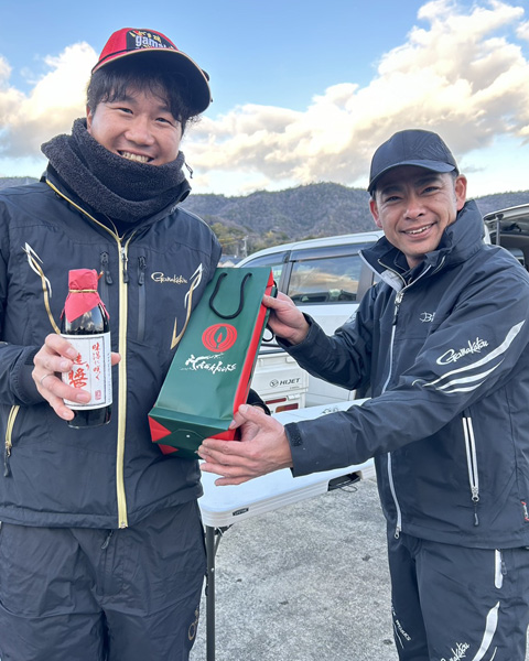 表彰式後には、参加者全員でお楽しみ抽選会を行いました。いつもお世話になっている釣具メーカー様、参加者の皆さま、釣友の皆さま、私の地元“たけはら”の企業さま、生産者の皆さまより多大なるお力添えを頂き、豪華賞品の数々で新春にふさわしい華やかな抽選会を行う事ができました。この場をお借りしてお礼申し上げます。