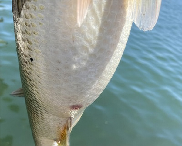 「ソラローム®エクスレッド 10lb」の5gヘビーダウンショットで粘っているとウィードからのハングオフで待望のバイトがあり、捕れたのは小型ながらキーパーサイズでした。