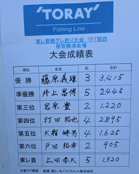 今大会の会場は近畿で一番遠い那智勝浦。参加頂いた素晴らしい皆様に感謝。それからいつも機嫌よく大会を受けて頂く清丸渡船様にも重ねて感謝いたします。寒グレも後半戦 皆様東レのラインで楽しい釣りをしましょう。