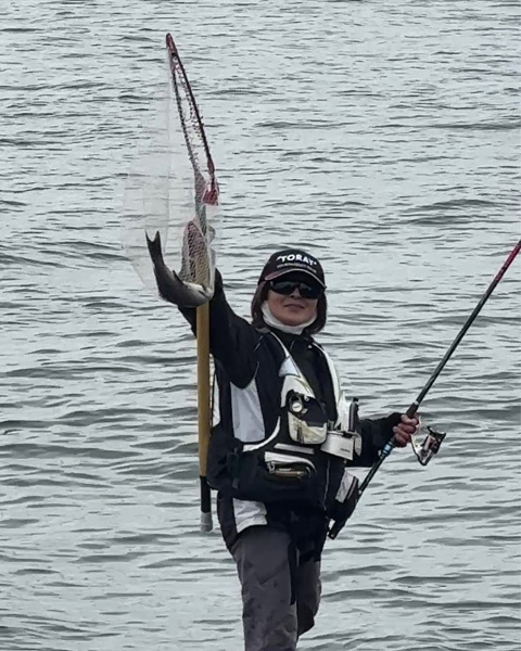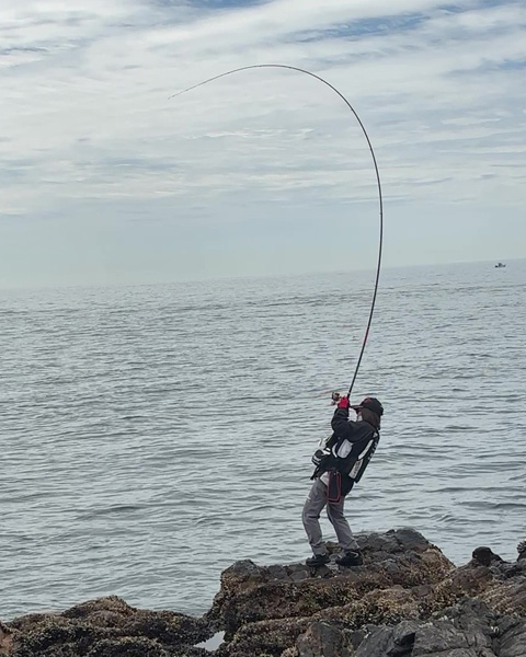 早々に嬉しいお土産を確保すると、気持ちに余裕ができるのも釣り人あるあるですよね! 次は船着で竿を出していた旦那にアタリが! これまた良型なのか良い感じに竿が曲がっています!