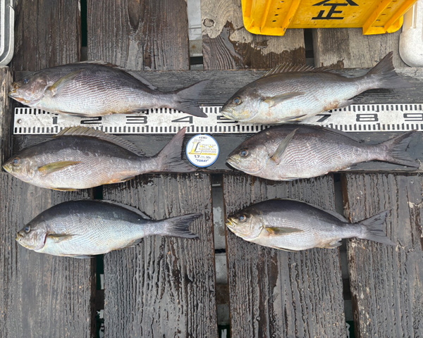 その後も潮の動きは悪く、餌取りも出てこない状況のまま、なんとか旦那が「43」を追加! 私は「38」、「40」、「43」と追加!! 終わってみればジャンボイサキオンリーのお祭りでございました!